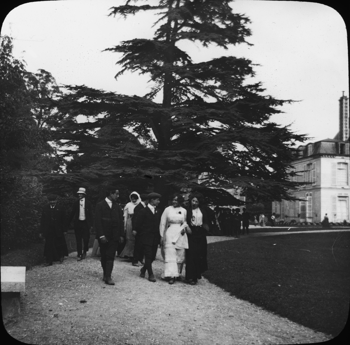 Skioptikonbild med motiv av sällskap vid cederträ i slottsparken vid Château La Malmaison.