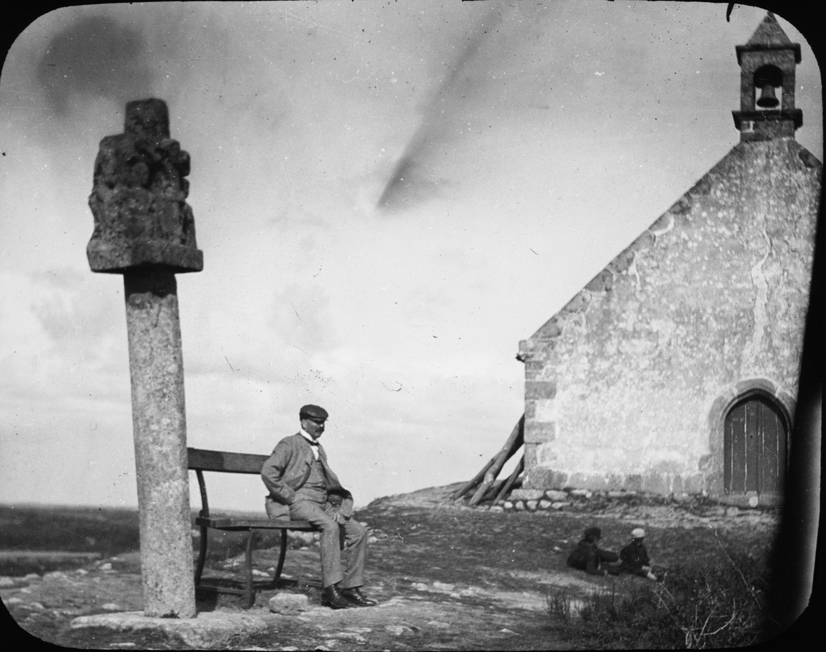 Skioptikonbild med motiv av man på bänk vid kyrka i Carnac.