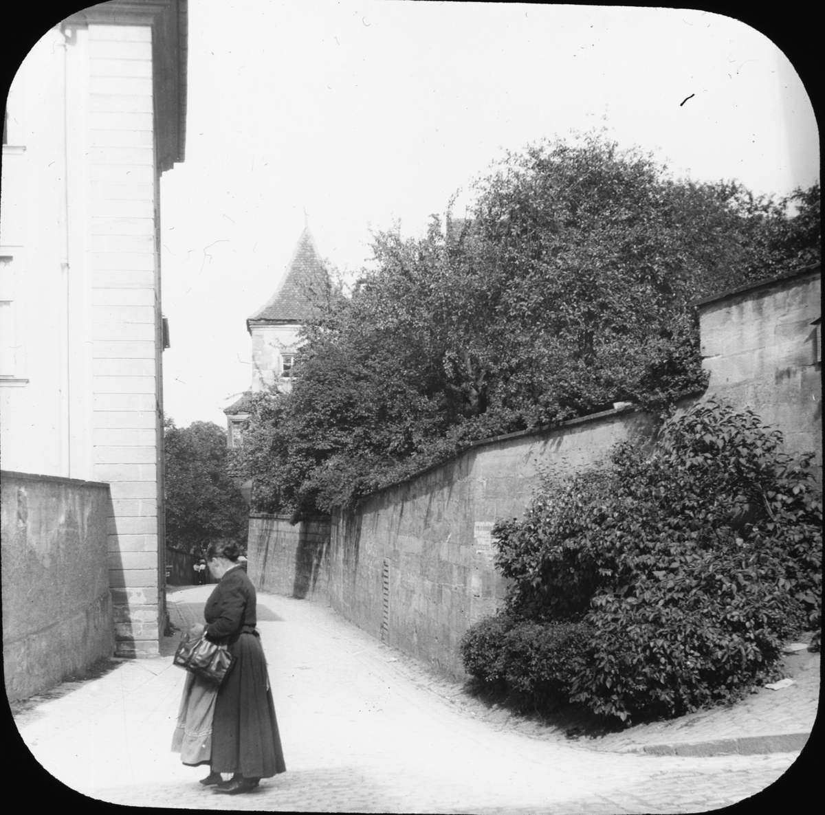 Skioptikonbild med motiv av kvinna på gata i Bamberg.