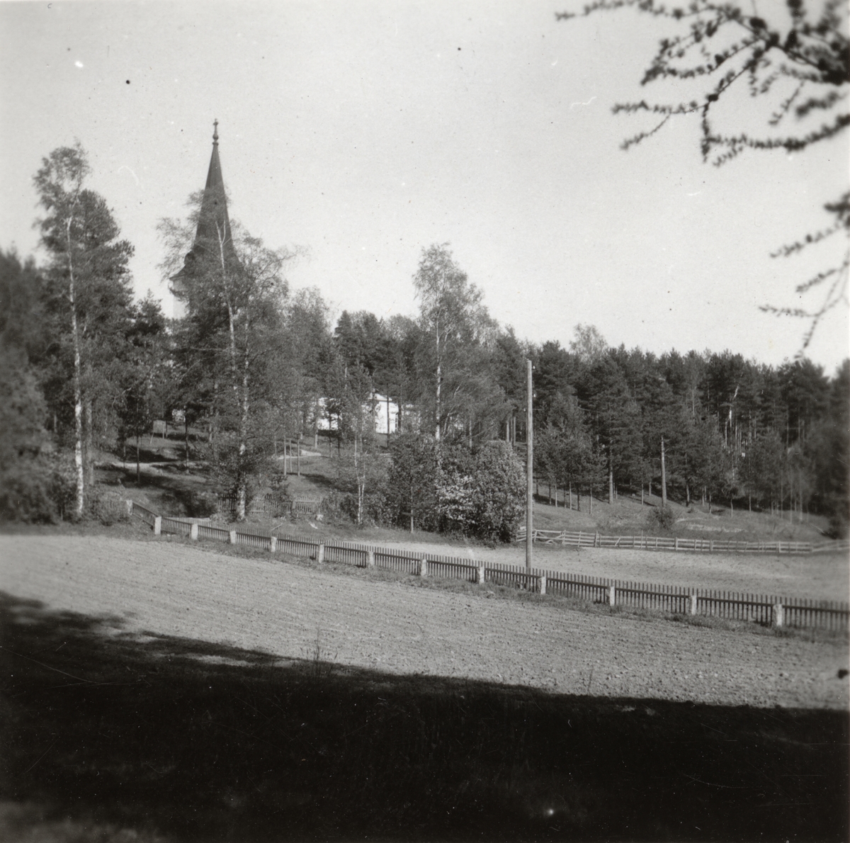 Utsikt från prästgården mot Mo kyrka. Prästgården var tidigare verkstadsbyggnad vid Flors Linnefabrik, Hälsingland. I sluttningen nedanför kyrkan låg små jordstugor där linet bereddes och vävning ägde rum.