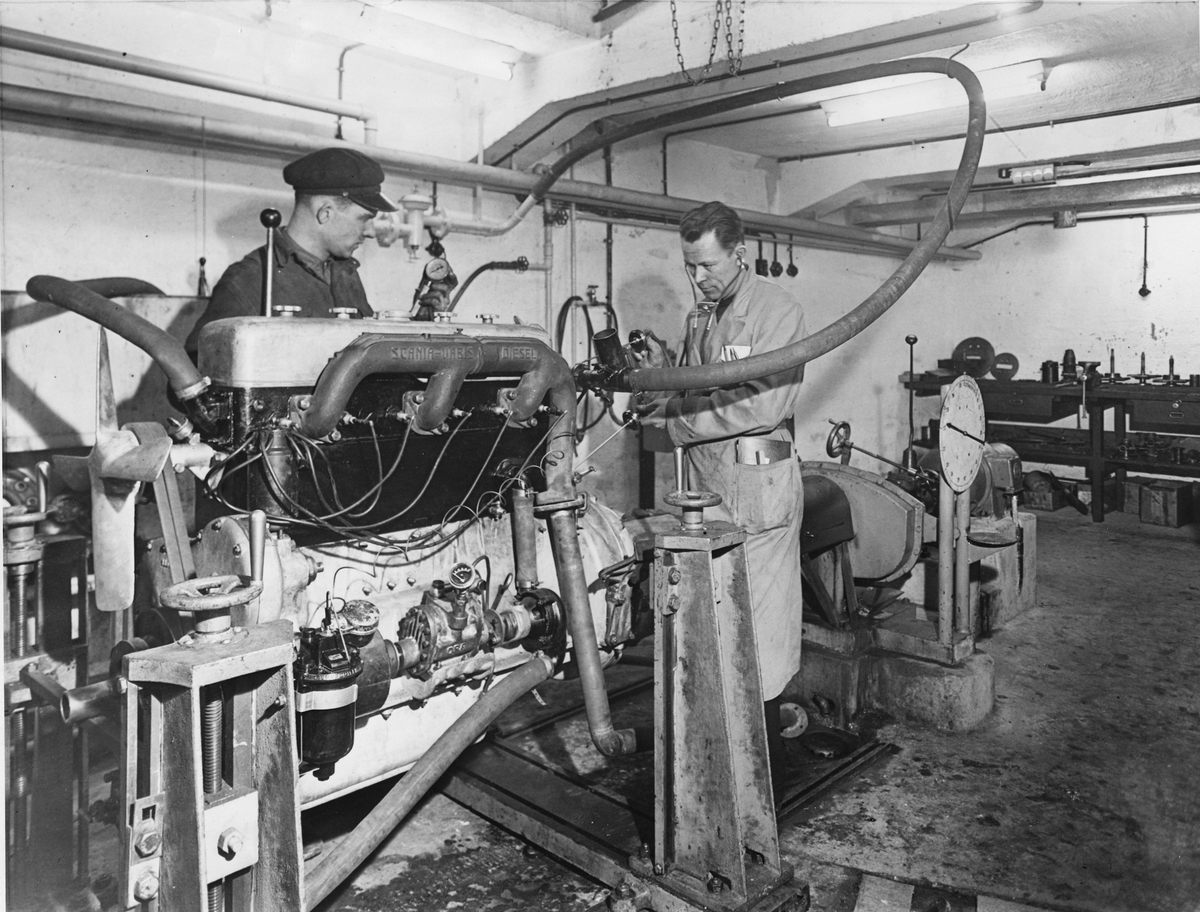 Sterner och Blomquist AB, Malmö, 1944. I det moderna provrummet prov- och inköras motorerna med varierande varvtal och belastning. Vid provkörningen upprättas diagram och effektkurvor över de erhållna väderna.