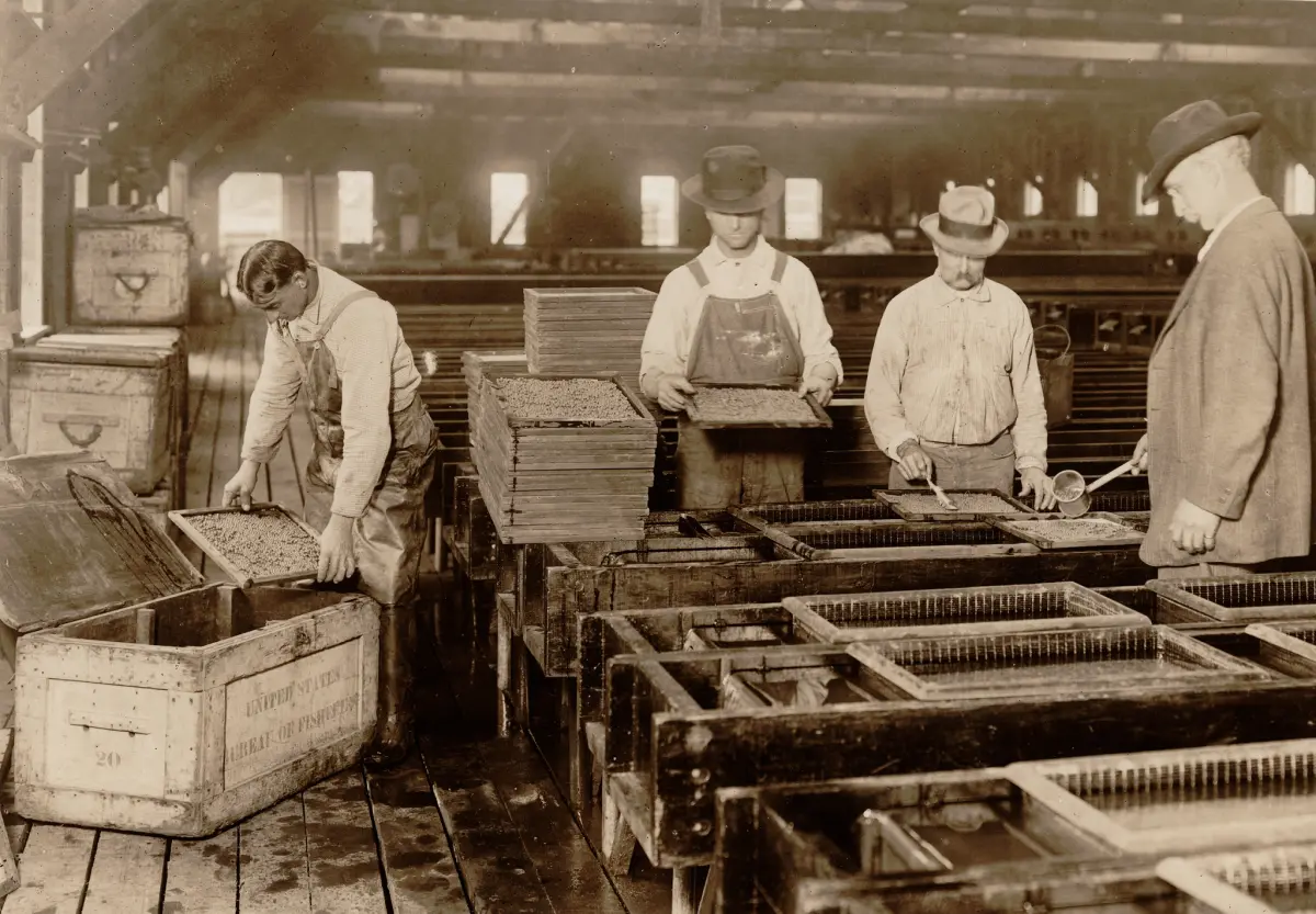 Sortering av laxrom vid fiskfabrik i Battle Creek, Californien.