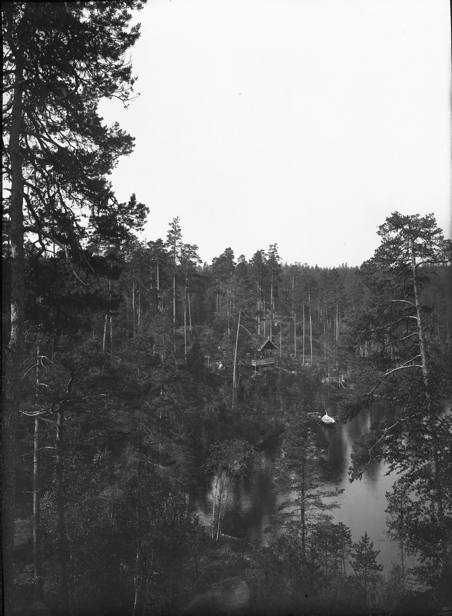 Fönsterbild med motiv av hytta i skogslandskap vid sjö, möjligen i Hedemoratrakten.