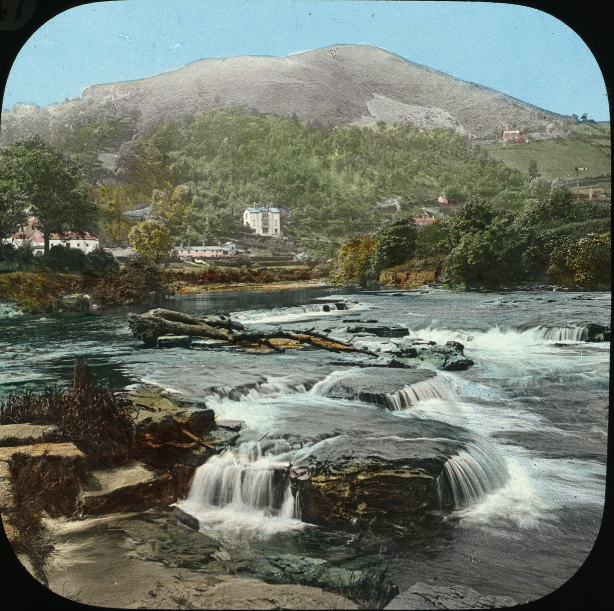 Kolorerad skioptikonbild med motiv av en fors i bergslandskap.