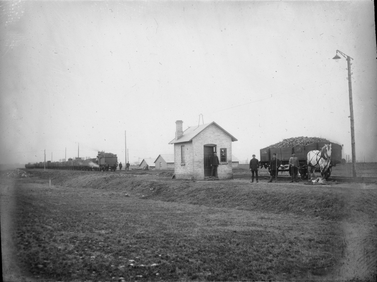 Skioptikonbild med motiv från yrkesinspektionens undersökningar på olika arbetsplatser. Transoprt av sockerbetor.