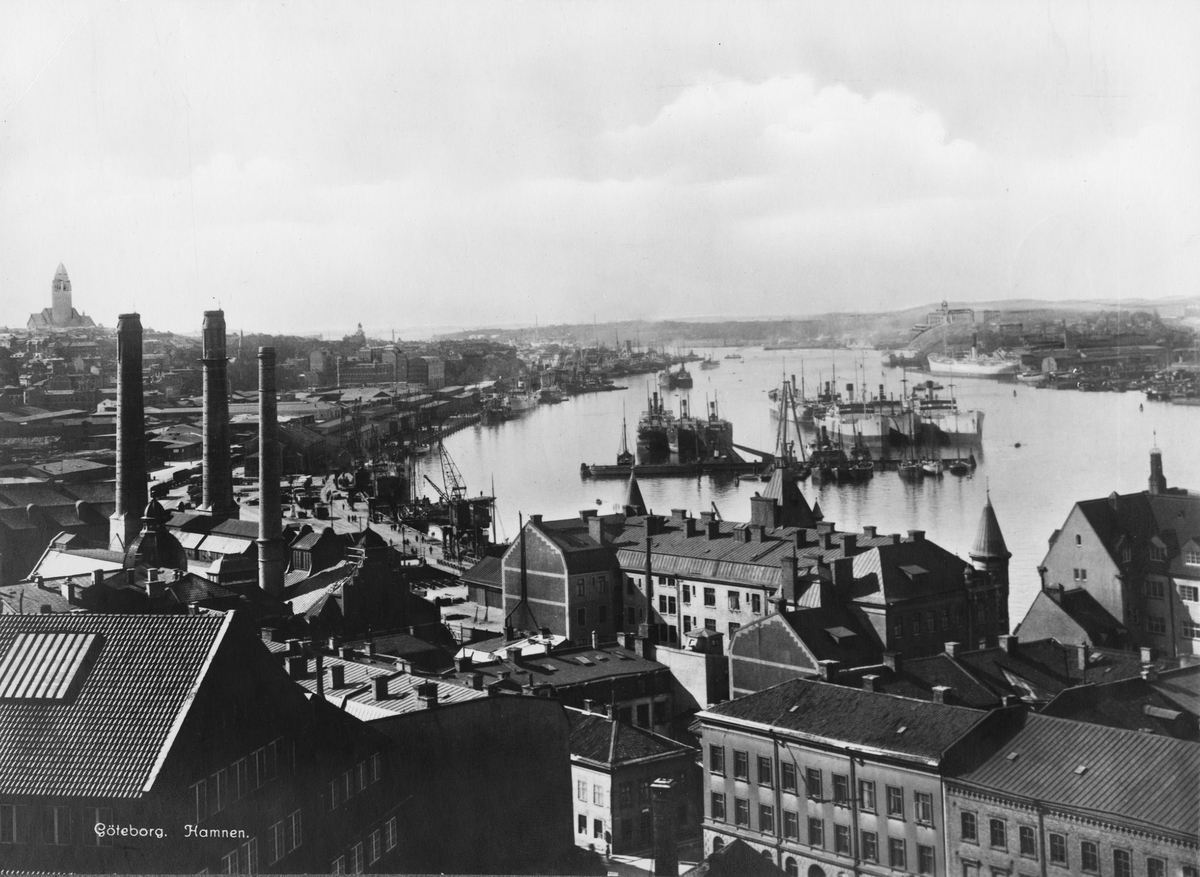 Vy över Göteborgs hamn. Till vänster Skeppsbron och Masthugget, till höger Hisingen med Götaviken.