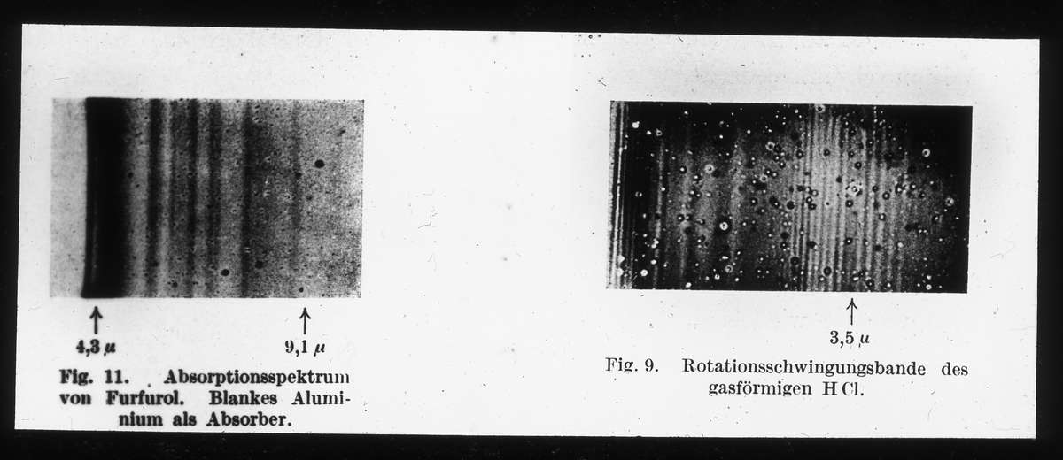 Till vänster: Absorptionsspektrum av furfural. Rent aluminium absorberar. Till höger: Rotations-vibrations band av gasformig HCl.