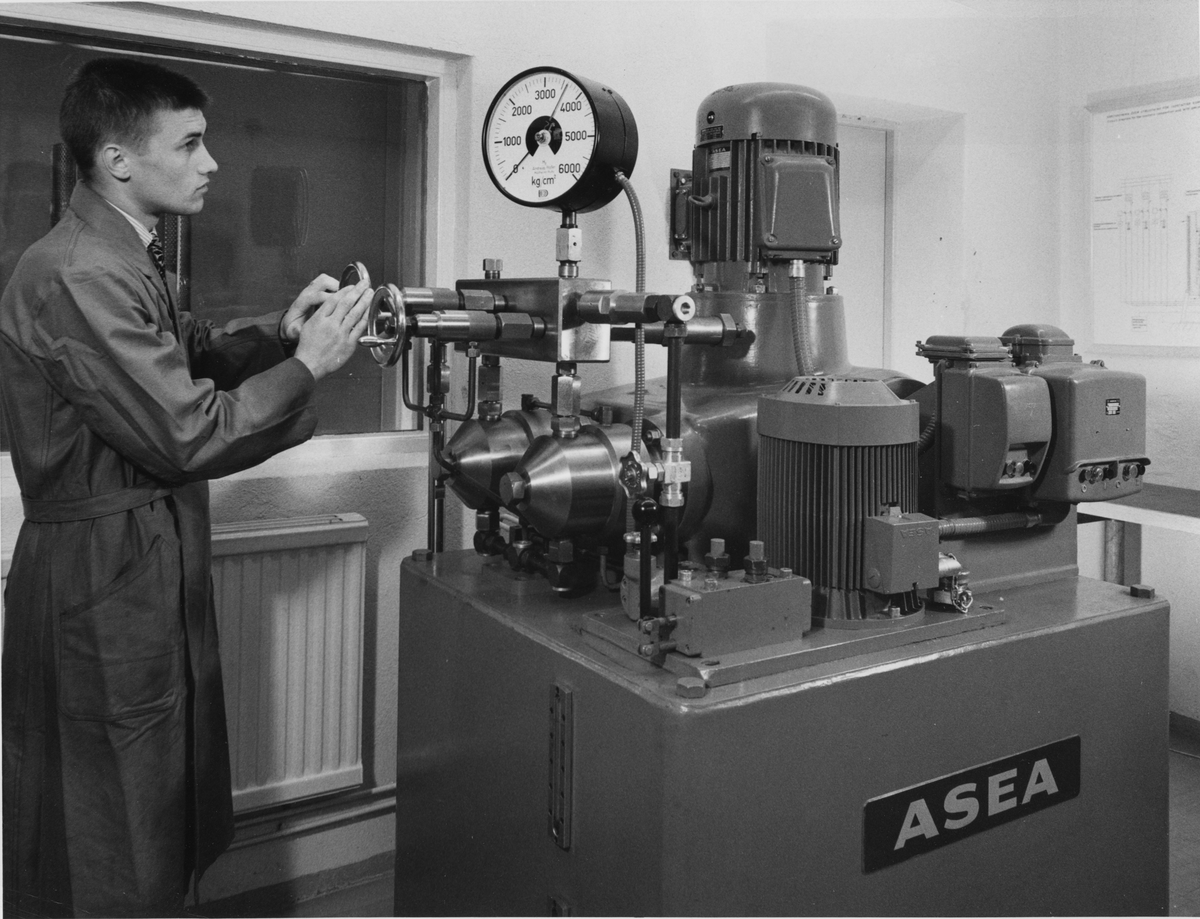 ASEAs högtryckslaboratorium i Robertsfors. Invigt 1 september 1965. Pumpagregat till högtryckskammare. Max arbetstryck 5000 atö.