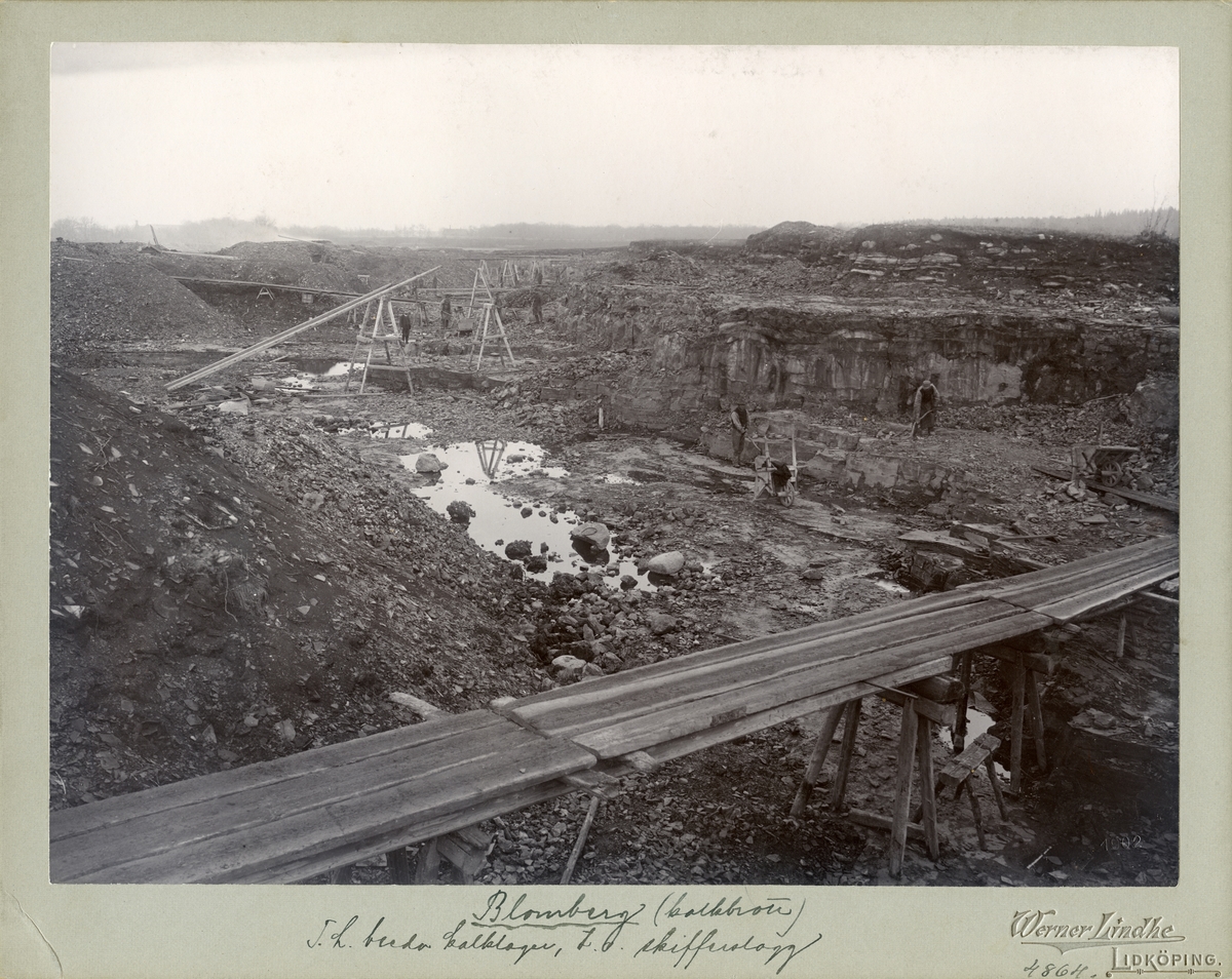 Blombergs kalkbrott, tillhöger kalkugnar, till vänster skifferslagg efter bränningen. I fonden till vänster syns härdugnen.