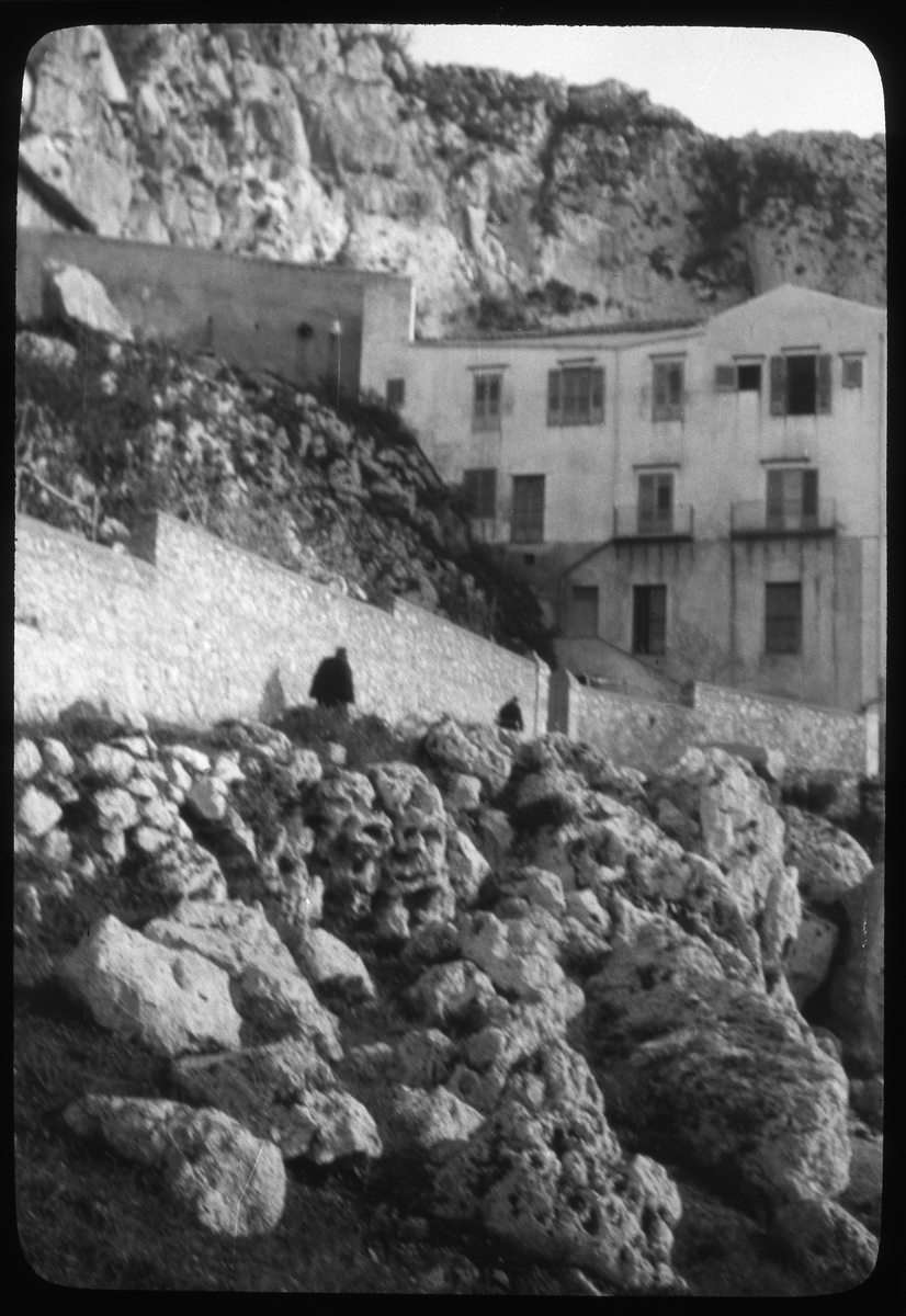 Skioptikonbild från institutionen för fotografi vid Kungliga Tekniska Högskolan. Bilden är troligen tagen av John Hertzberg under en resa i Europa. Hertzberg blev docent i fotografi 1921vid Kungliga Tekniska Högskolan i Stockholm. Hus vid bergvägg.