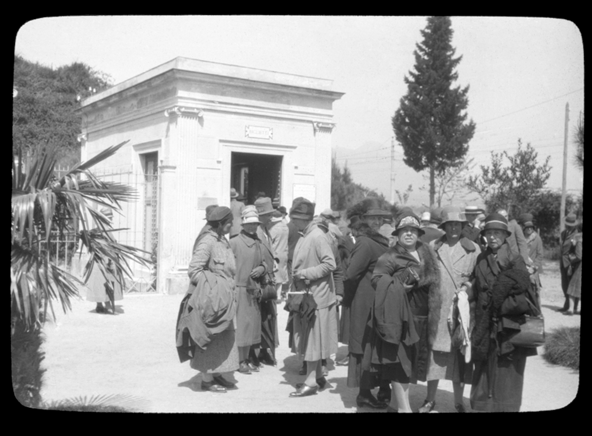 Skioptikonbild från institutionen för fotografi vid Kungliga Tekniska Högskolan. Motiv föreställande sällskap utanför ett mausoleum, sannolikt i södra Italien. Bilden är troligen tagen av John Hertzberg under en resa i Europa..