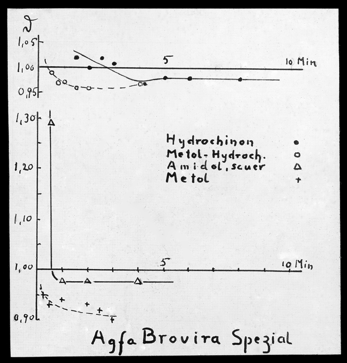 Skioptikonbild från institutionen för fotografi vid Kungliga Tekniska Högskolan. Använd av professor Helmer Bäckström som föreläsningsmaterial. Bäckström var Sveriges första professor i fotografi vid Kungliga Tekniska Högskolan 1948-58. Motiv föreställande "Agfa Brovira Spezial" (för mer text se bilden).