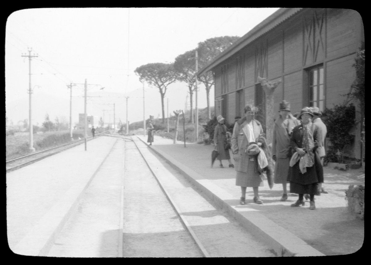 Skioptikonbild från institutionen för fotografi vid Kungliga Tekniska Högskolan. Motiv föreställande sällskap vid tågstation, i södra Italien. Bilden är troligen tagen av John Hertzberg under en resa i Europa..