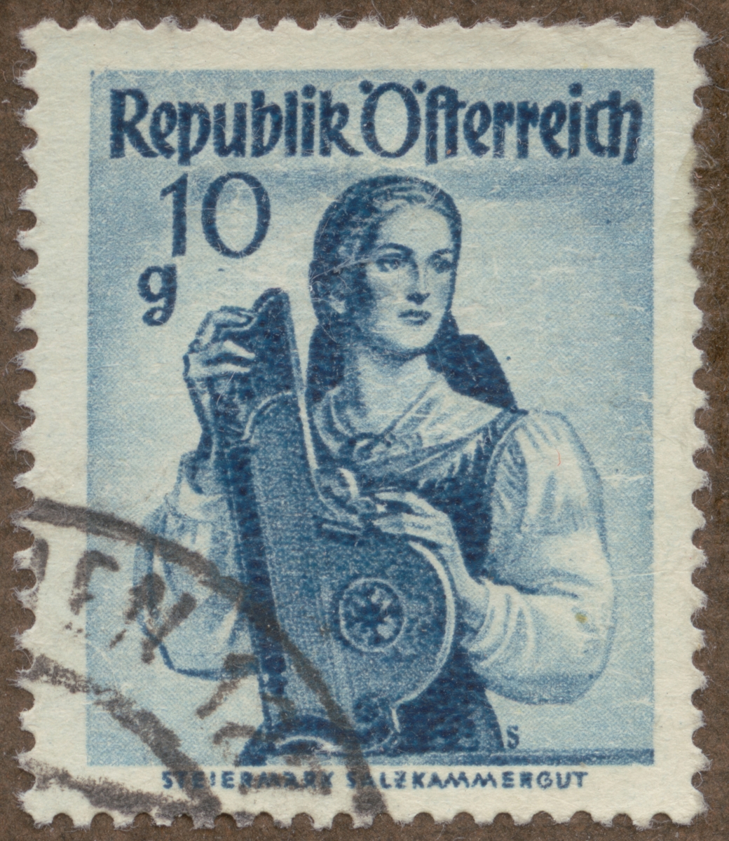 Frimärke från Österrike, 1948. Motiv av kvinnlig österrikisk dräkt, Steiermark - Salzkammergut.