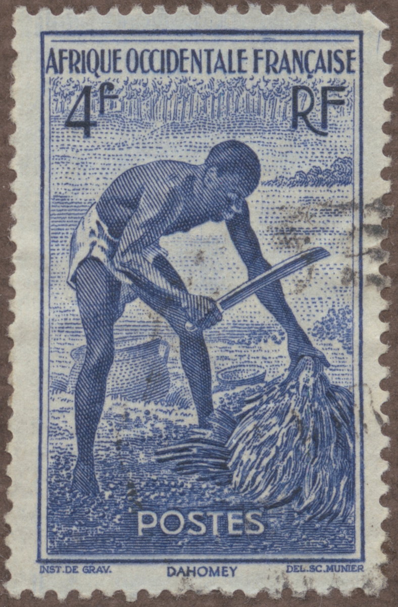 Frimärke från Franska West Afrika, 1945. Motiv av Skörd av Dadlar i Dahomey