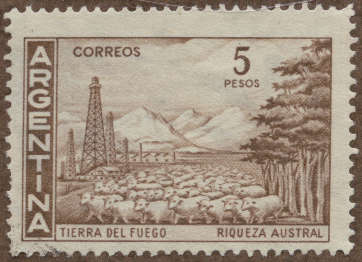 Frimärke från Argentina, 1959. Motiv av Fårhjord på Eldslandet, Tierra del Fuego.