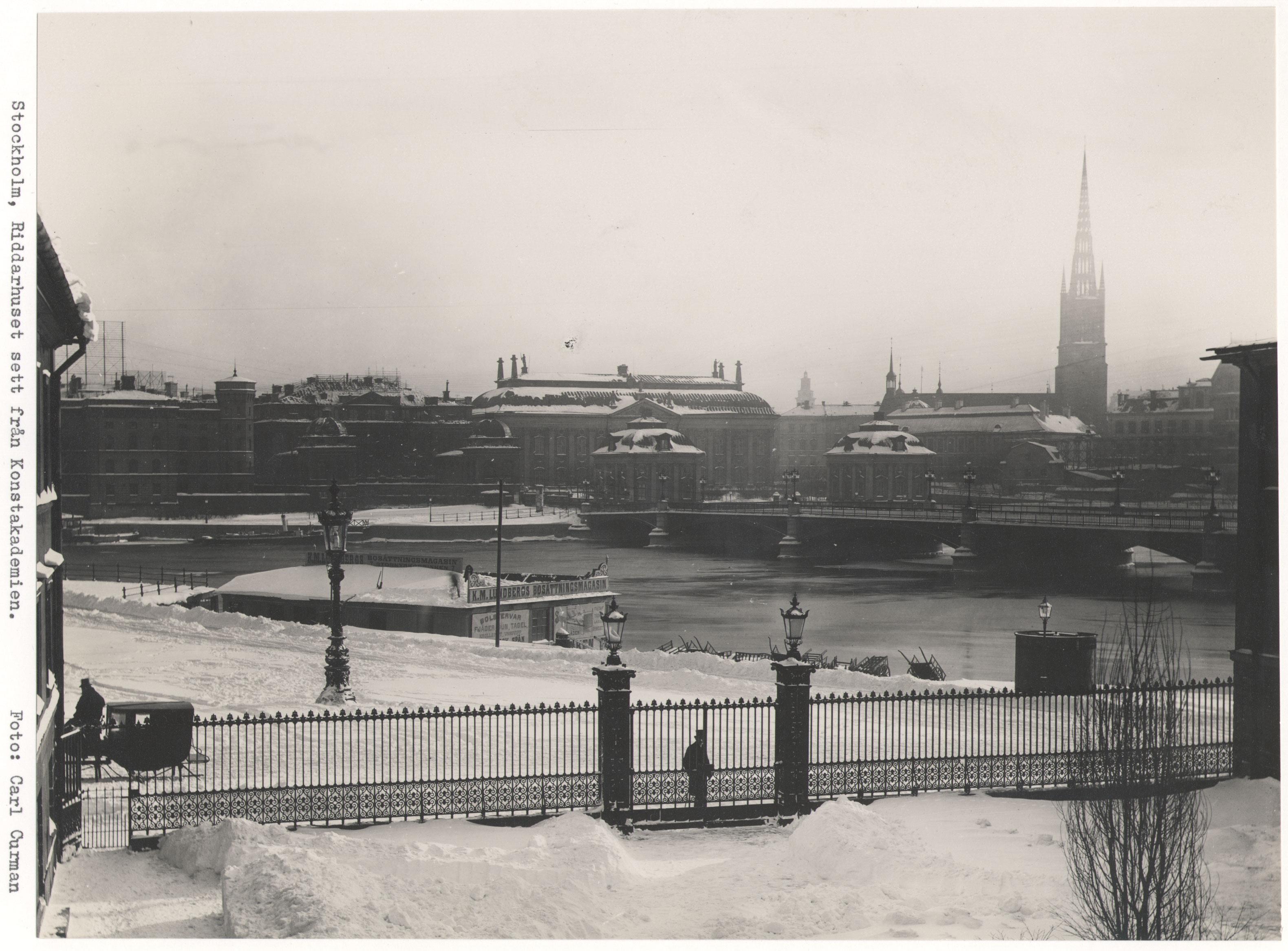 Riddarhuset sett från Konstakademien. Bilden antagligen fotograferad före 1896, då var ombyggnaden klar av Konstnärsakademin och gården med staket och grindstolpar försvann i den ombyggnaden.