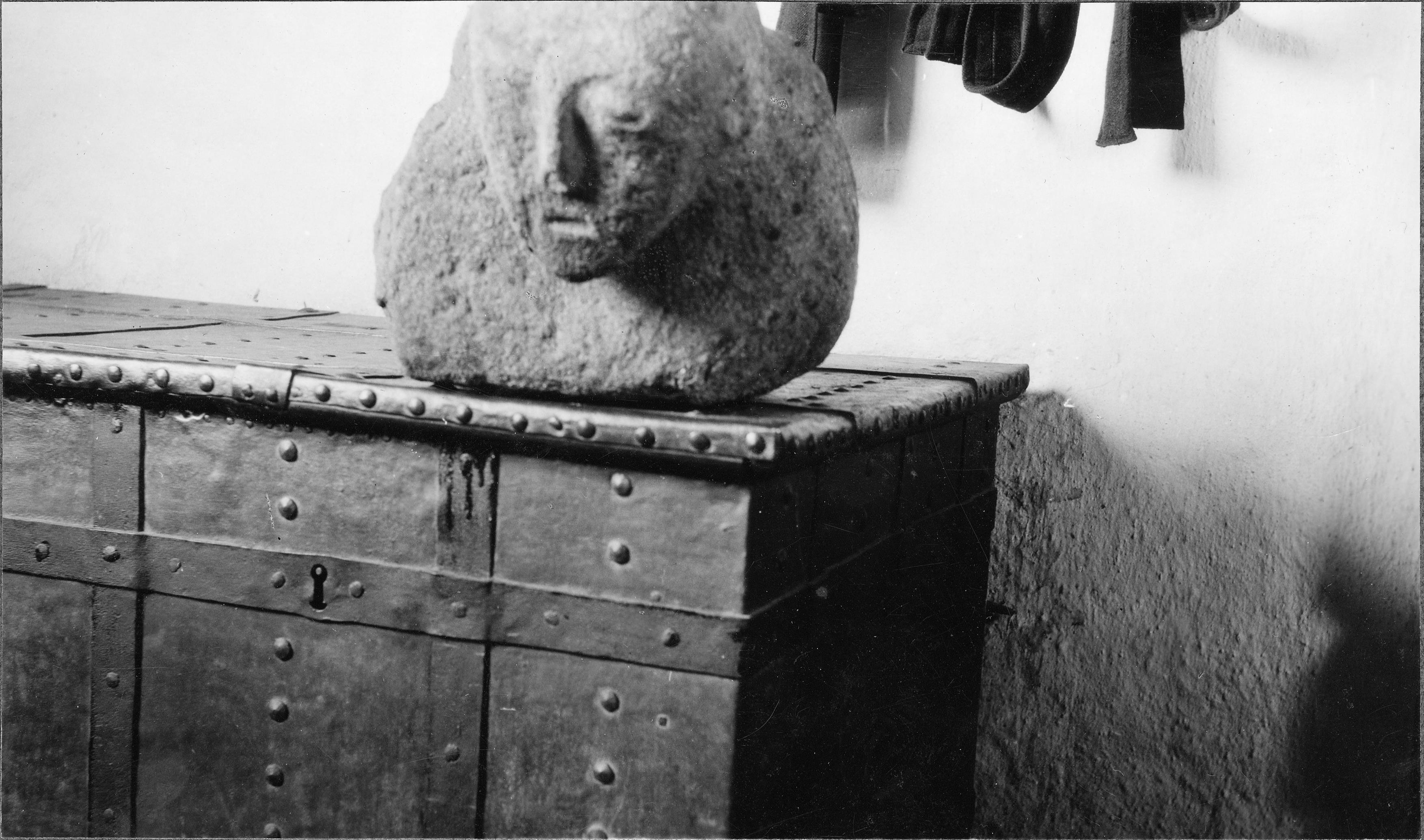 Arkitekturskulptur huggen i granit föreställande manshuvud utan hals. På kyrkogården i öster.