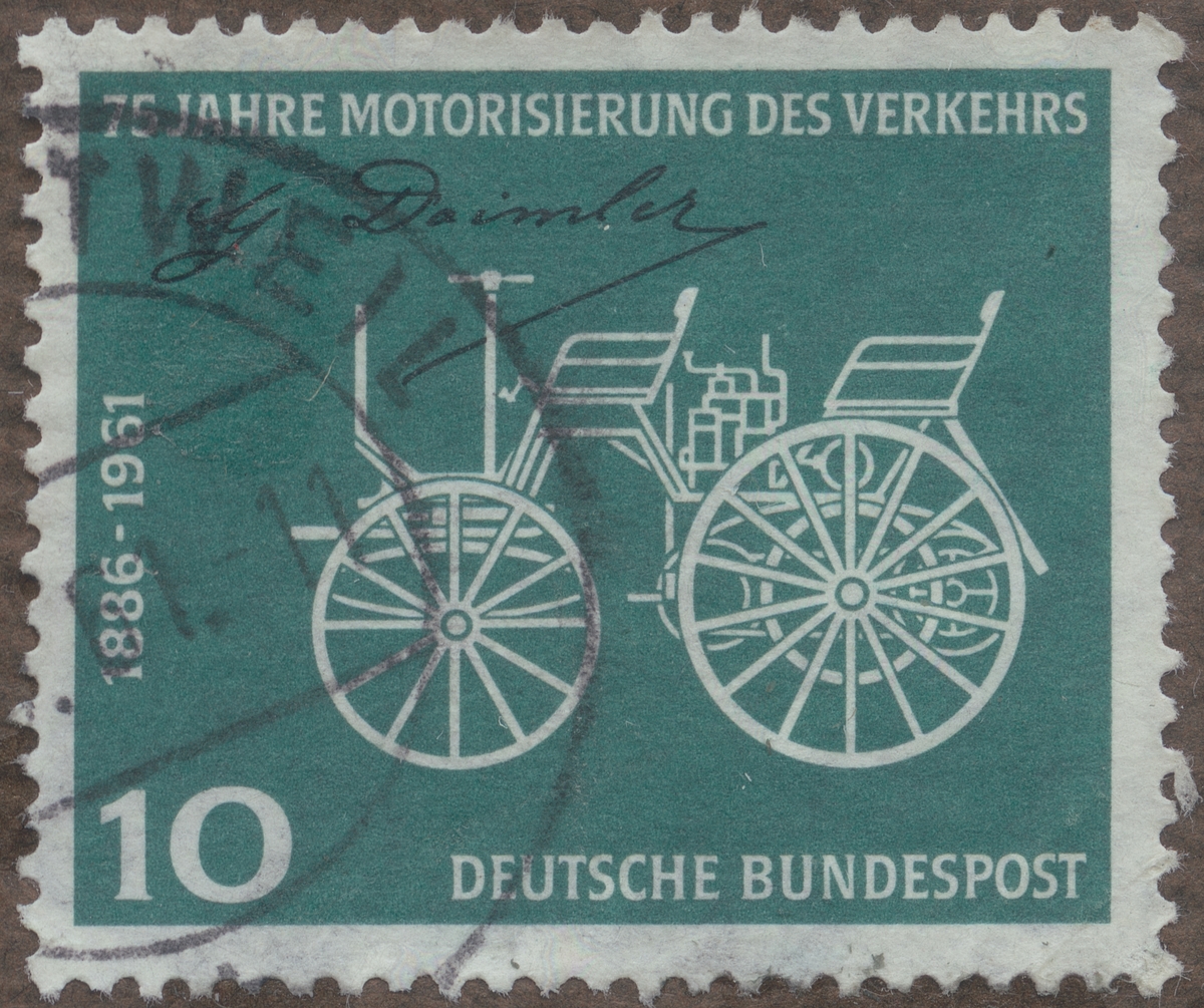 Frimärken ur Gösta Bodmans filatelistiska motivsamling, påbörjad 1950. Frimärke från Västtyskland, 1961. Motiv av Daimler bilen med bensinmotor: 1886 "konstruerat av tyska ingeniören Gottlieb Daimler (1834-1900). - Tyska motoriserade kommunikations- med 75 år: 1886-1961."