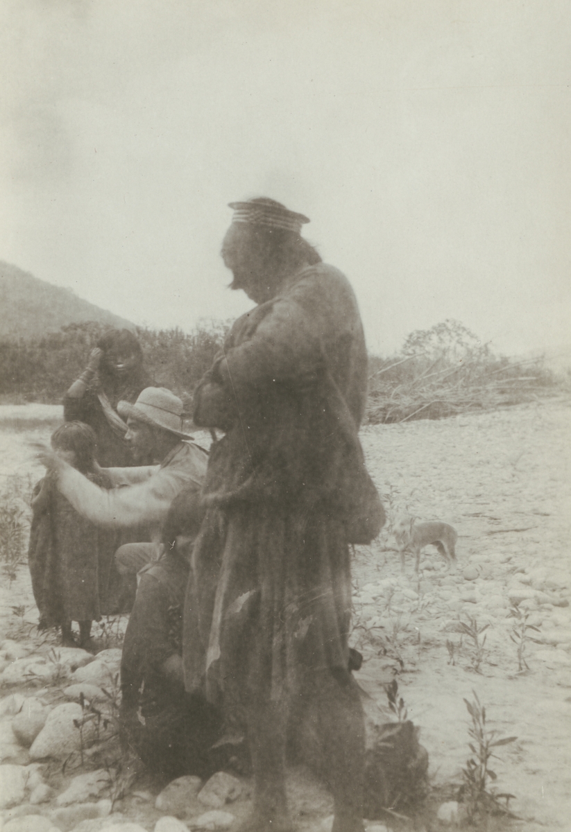 Fotografi från kuvert märkt med "Ernst Nordenskjöld". Motiv av män och barn vid flod i djungel.