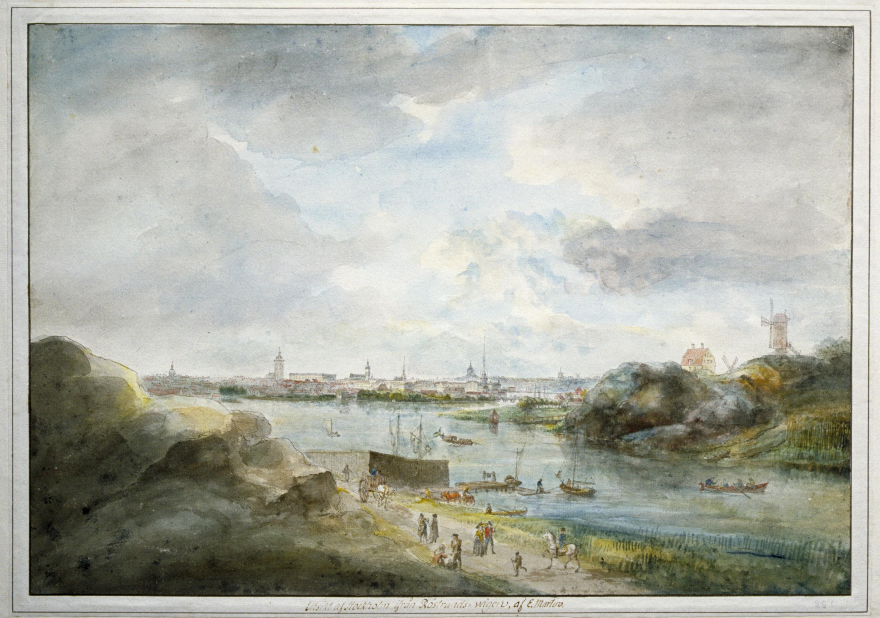 Utsikt från Rörstrandsgatan in mot Stockholms centrala delar. Akvarellerad pennteckning av Elias Martin.