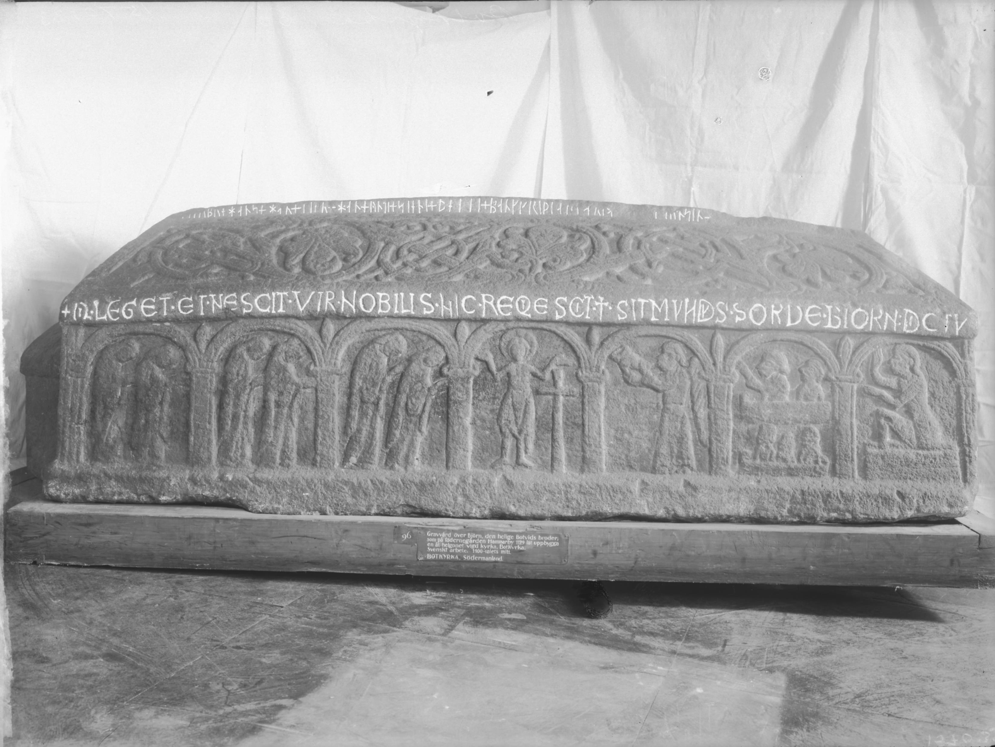 Botkyrkamonumentet. Gravvård av sandsten med grundform av en kyrka. 1100-talets första hälft.