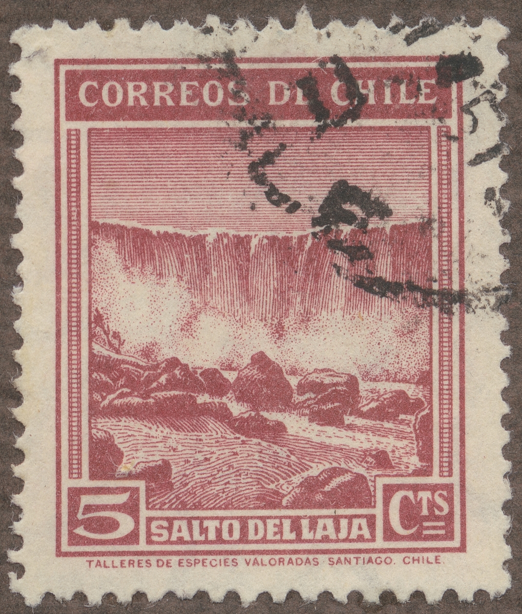 Frimärke ur Gösta Bodmans filatelistiska motivsamling, påbörjad 1950. Frimärke från Chile, 1938. Motiv av Vattenfallet vid Laja, Chile