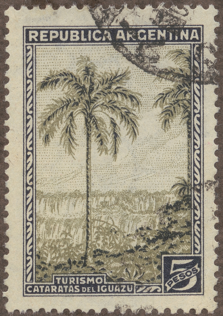 Frimärke ur Gösta Bodmans filatelistiska motivsamling, påbörjad 1950. Frimärke från Argentina, 1935. Motiv av Iguazu Vattenfall "Turistserie."