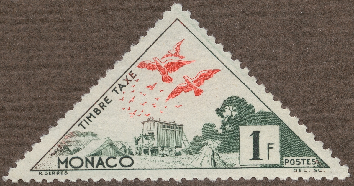 Frimärke från Monaco, 1953. Motiv av Brevduvor från militärt duvslag som flygsymboler Luftpost.
