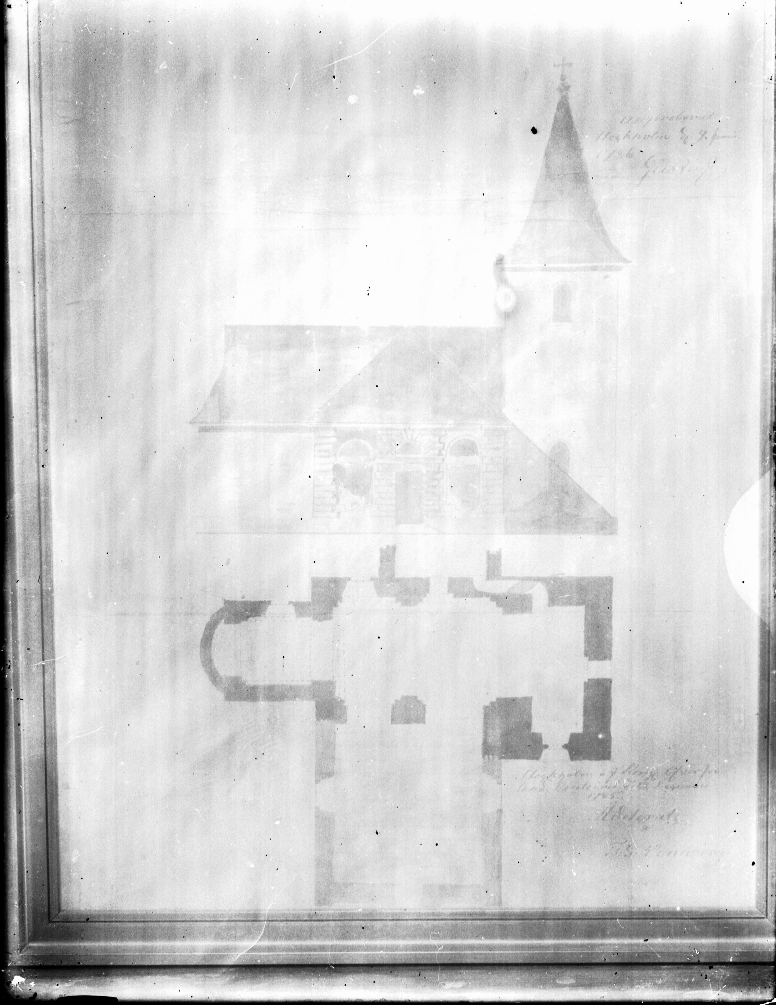 Fasad- och planritning över den gamla kyrkan. Snabbinv.