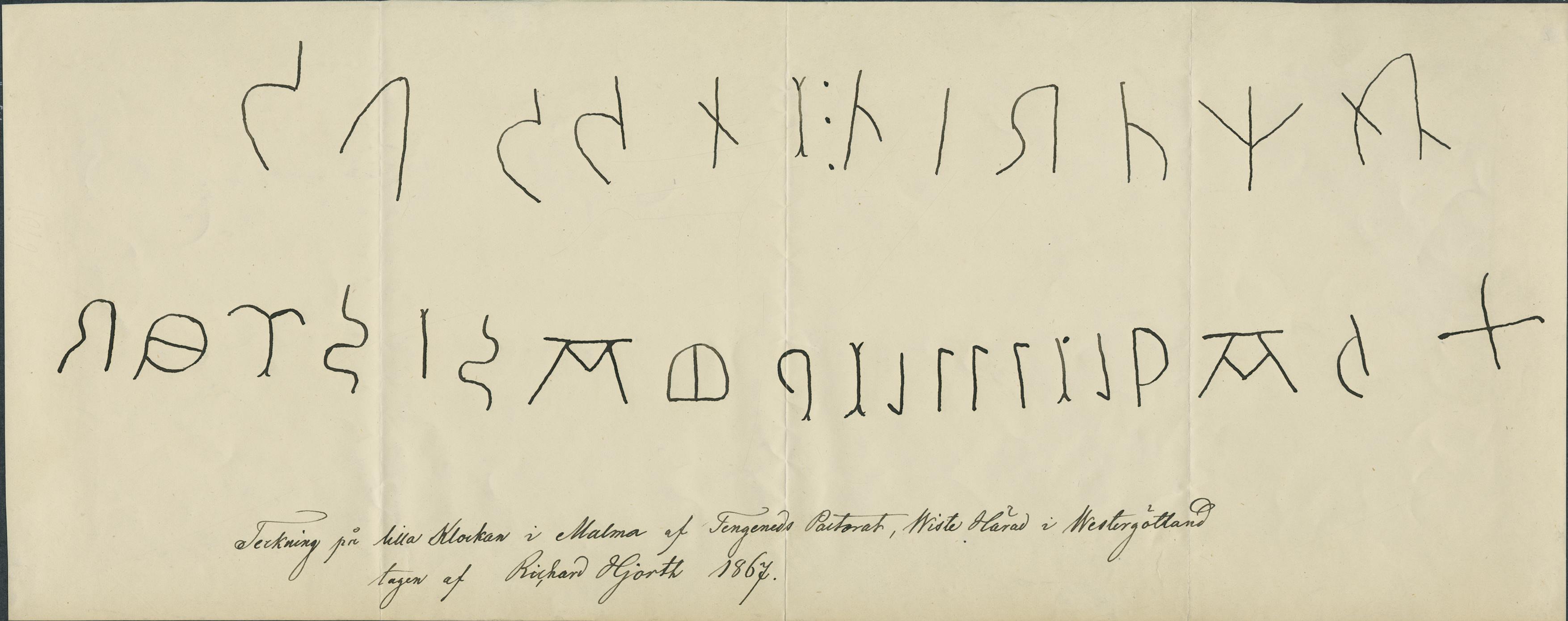 Klocka, teckning av inskription (överförd till Fridhem kyrka, Längnum socken, Västergötland).