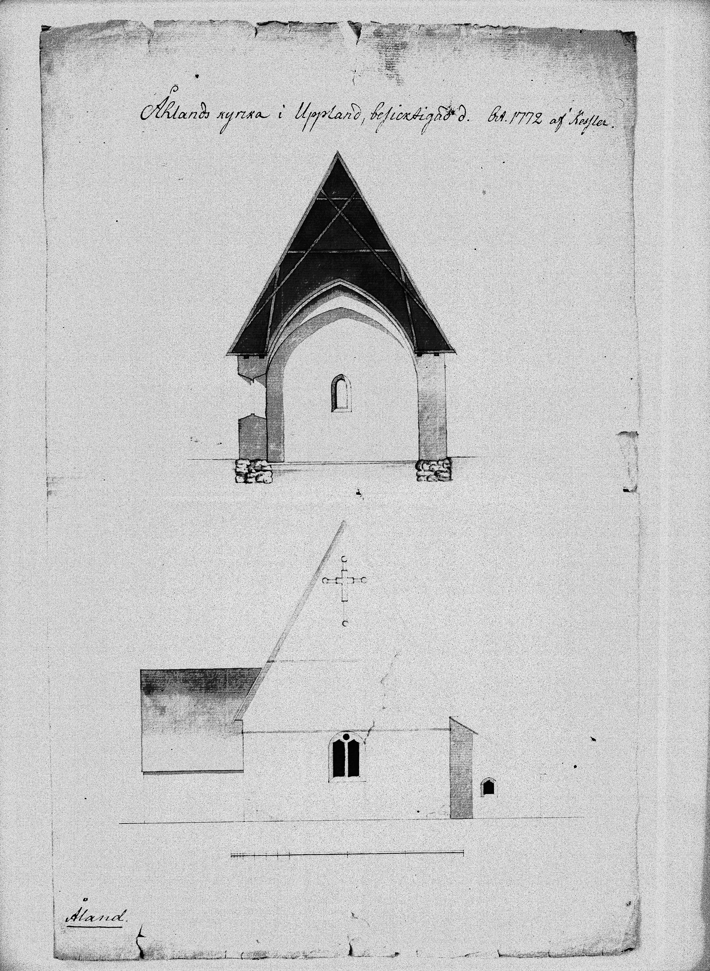 Kyrkan mot öster (underst) och tvärsnitt mot väster. Ritning, 1772. Avfotograferad.