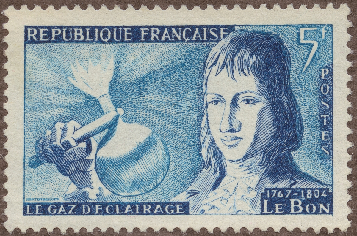 Frimärke ur Gösta Bodmans filatelistiska motivsamling, påbörjad 1950. Frimärke från Frankrike, 1955. Motiv av Lysgas genom torrdestillation av trä "av fransmannen Phillippe Le Bon 1767-1804 Serie: Uppfinnare"