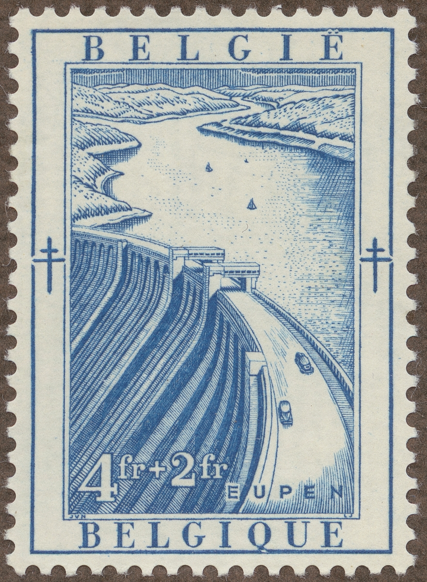 Frimärke ur Gösta Bodmans filatelistiska motivsamling, påbörjad 1950. Frimärke från Belgien, 1952. Motiv av Kraftdamm vid staden Eupen, Weserfloden "-TBC-Märke-"