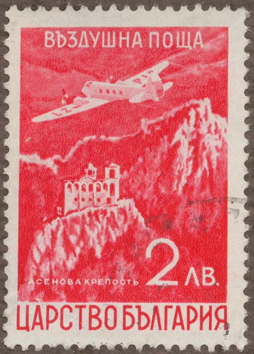 Frimärke från Bulgarien, 1940. Motiv av Två-motorigt Biplan över Tsar Asen III:s borg i bulgarisk bergsterräng. Luftpost.