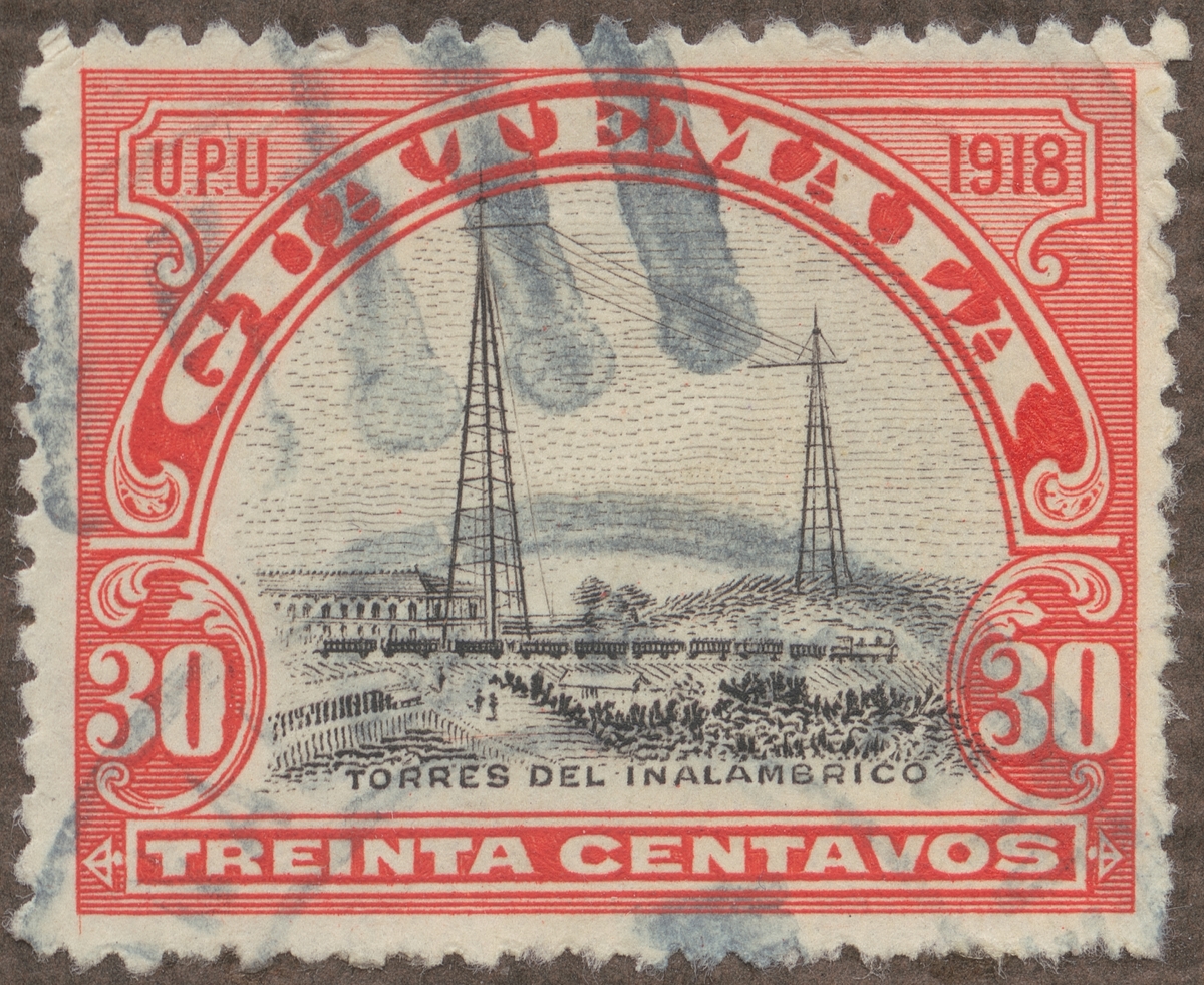 Frimärke ur Gösta Bodmans filatelistiska motivsamling, påbörjad 1950. Frimärke från Guatemala, 1918. Motiv av Radiomaster Inalambrico