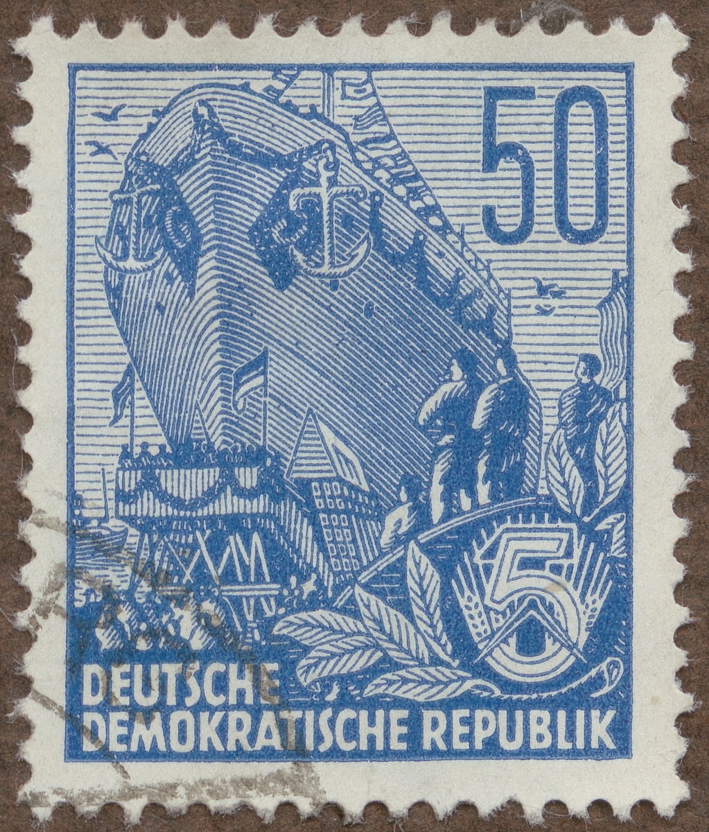 Frimärke från Östtyskland, 1958. Motiv av Ankare: Stapelavlöpning av ångare. -Östtyska 5-årsplanen: 1953-1958