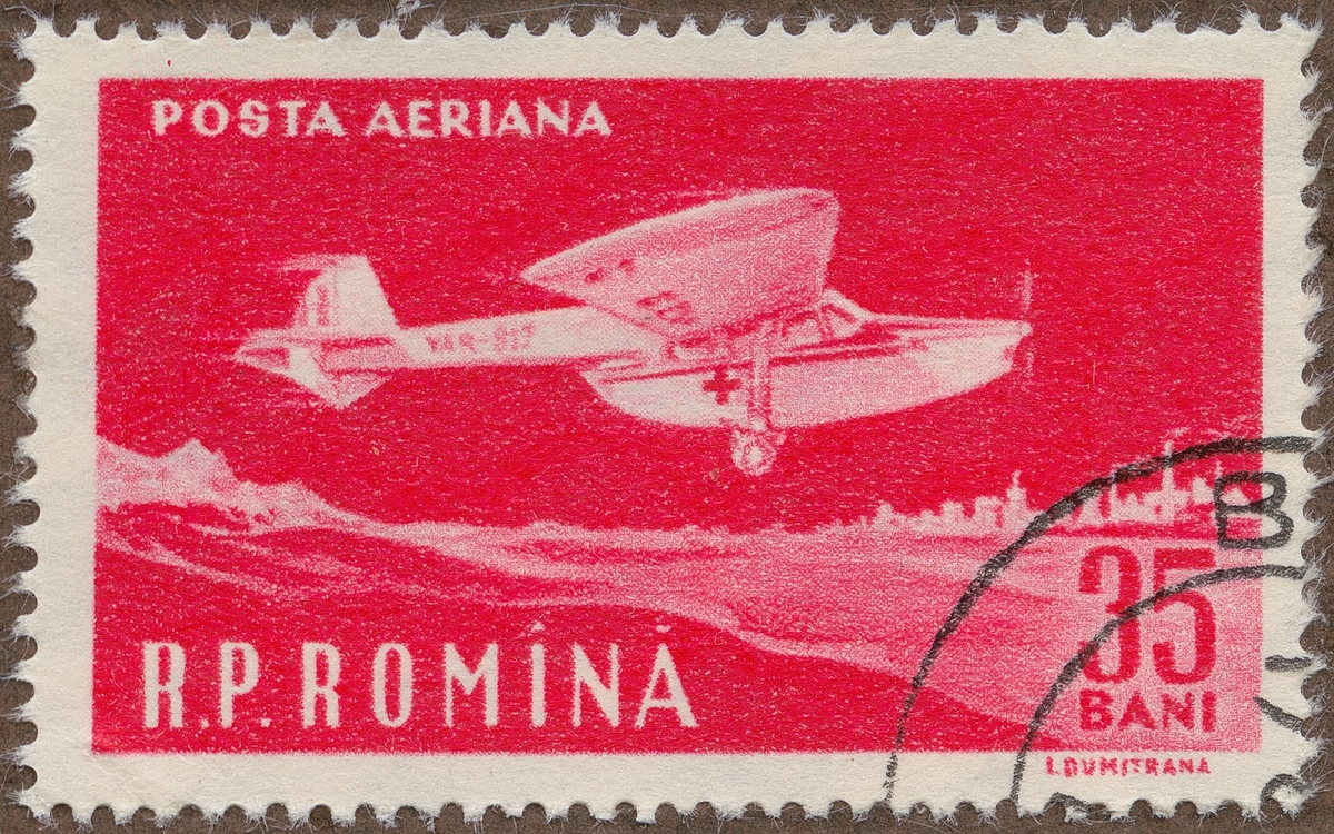 Frimärke från Rumänien, 1960. Motiv av Ambulans-Flygplan "Flygpost märke Flygets Dag och 50-årsjubileum av första rumänska flyget: 1910-1960."