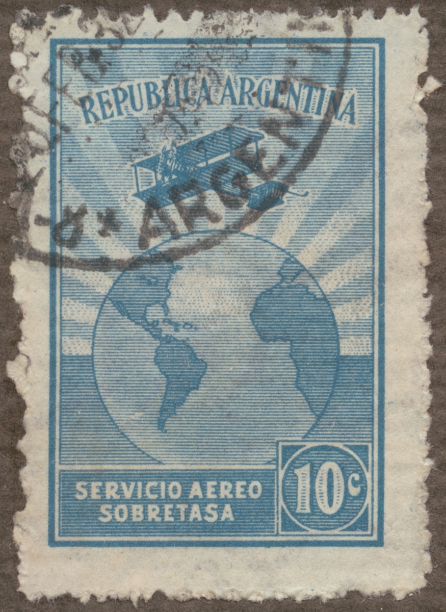 Frimärke från Argentina, 1928. Motiv av Flygmaskin, tvådäckare, över jordklotets två halvor