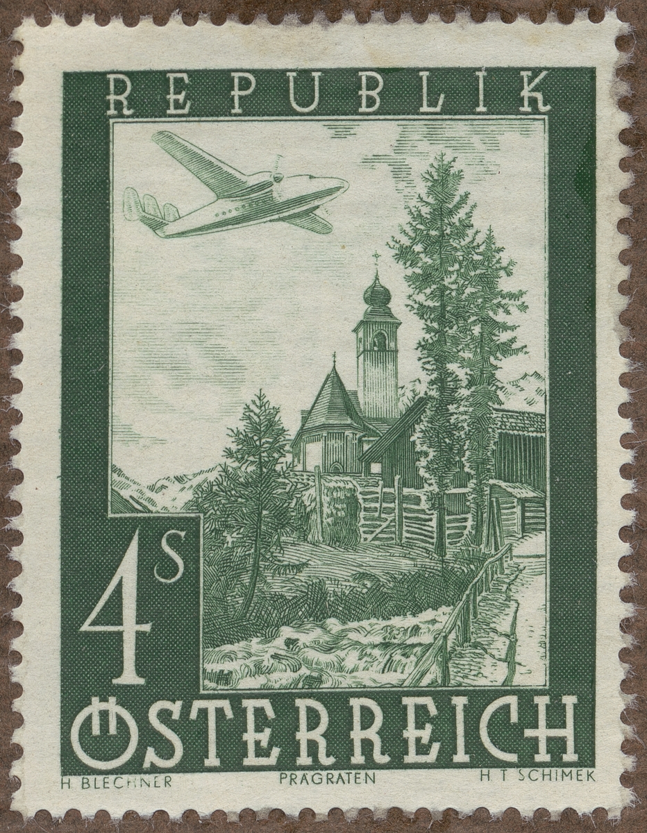 Frimärke från Österrike, 1947. Motiv av 2-motorigt Monoplan över Prägraten