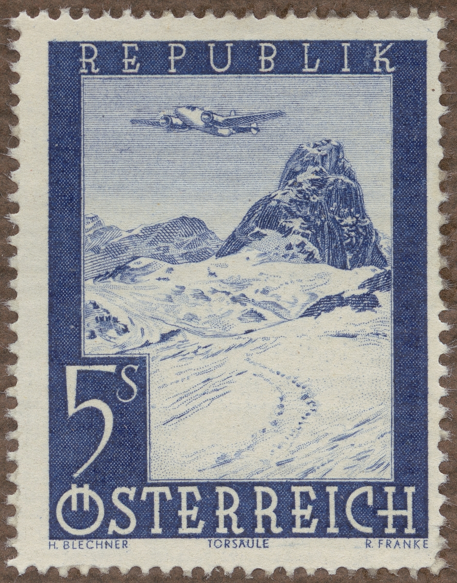 Frimärke från Österrike, 1947. Motiv av Tvåmotorigt monoplan över Torsäule, Salzburg.