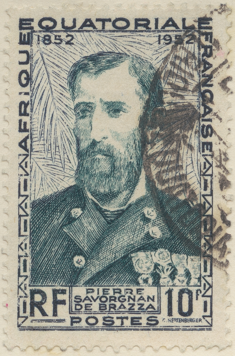 Frimärke från Franska Ekvatorial Afrika, 1951. Motiv av Pierre Savorgnan de Brazza: 1852-1905. Fransk upptäcktsresande och kolonigrundare. Förvärvade 1880 land för Frankrike nord om Kongo. -100-årsminne av hans födelse: 1852-1952.-
