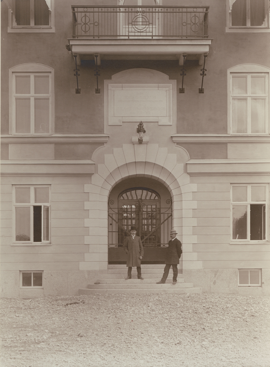 Två män utanför Uppsala kasernbyggnad, 1912.