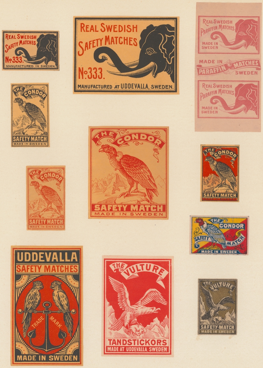 Etiketter för tändsticksaskar, från Svenskt Industri- och Handelsmuseum.