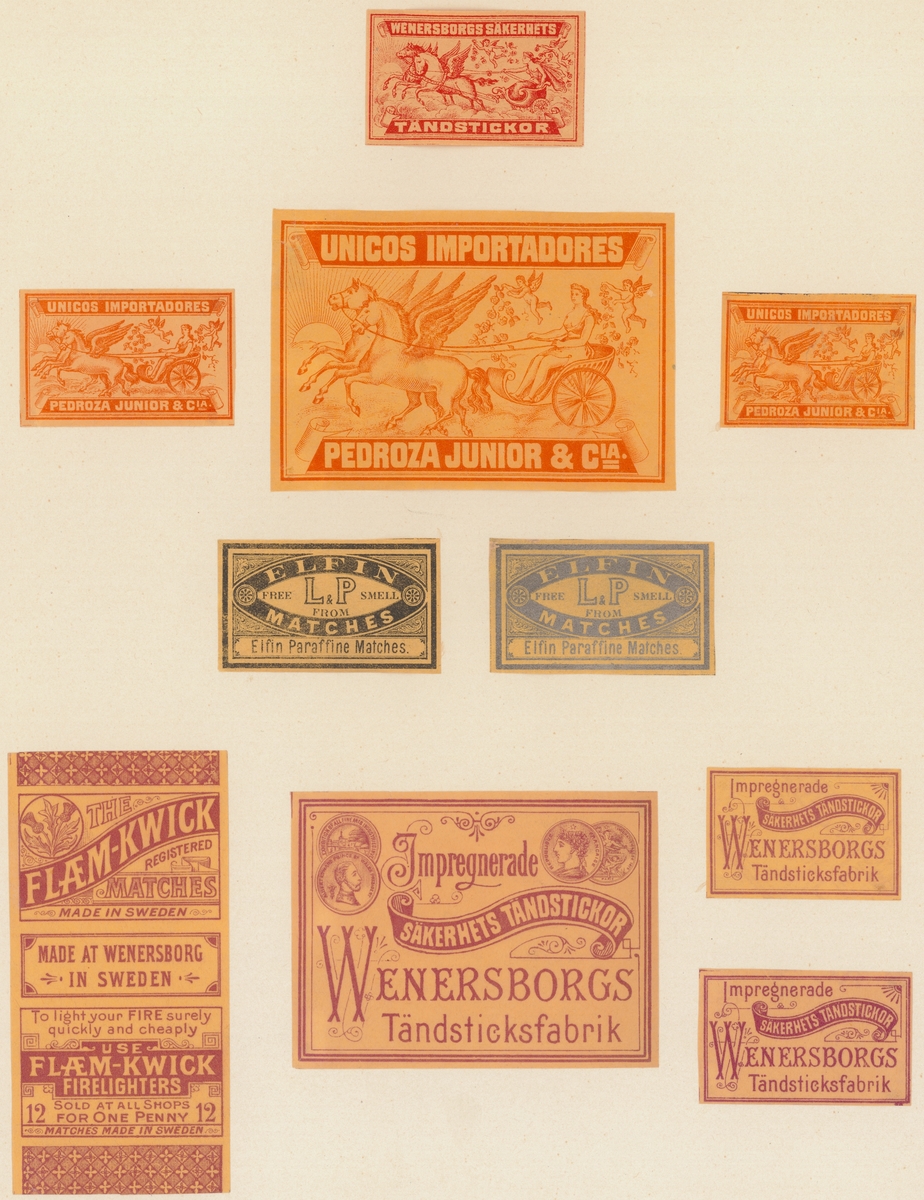 Etiketter för tändsticksaskar, från Svenskt Industri- och Handelsmuseum.