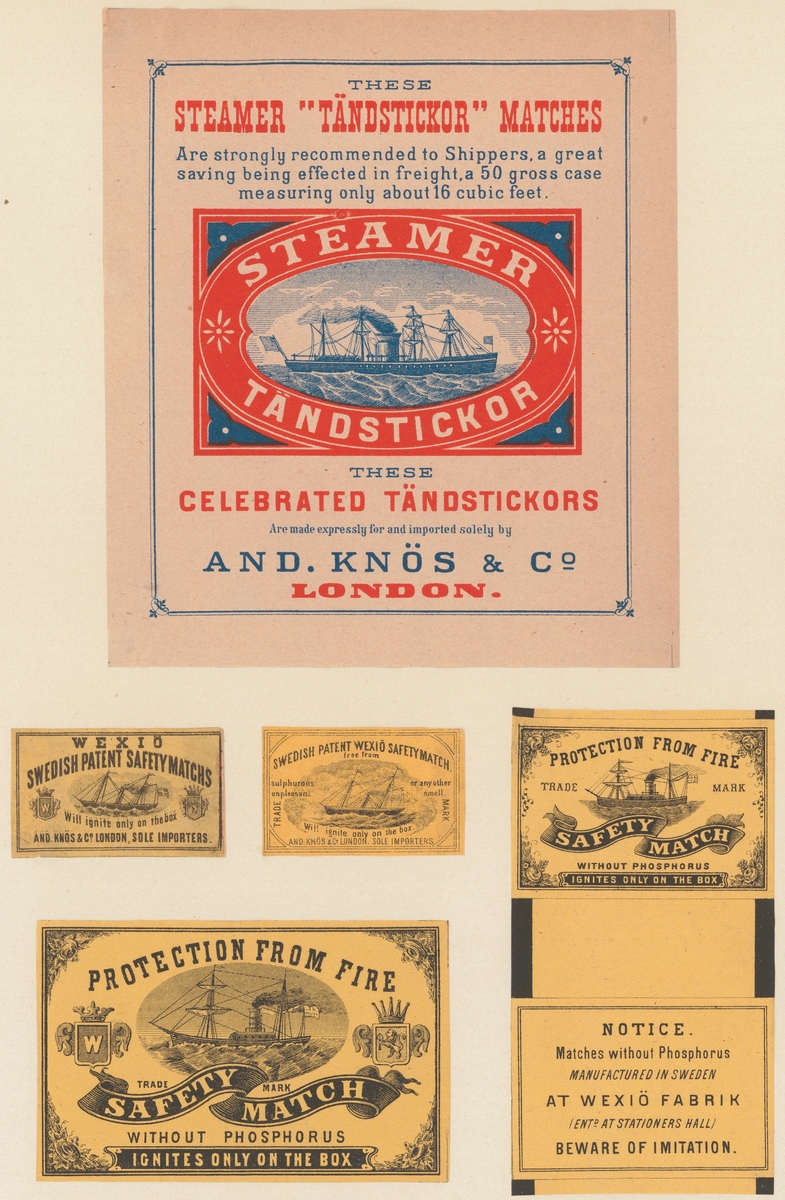 Etiketter för tändsticksaskar, från Svenskt Industri- och Handelsmuseum.