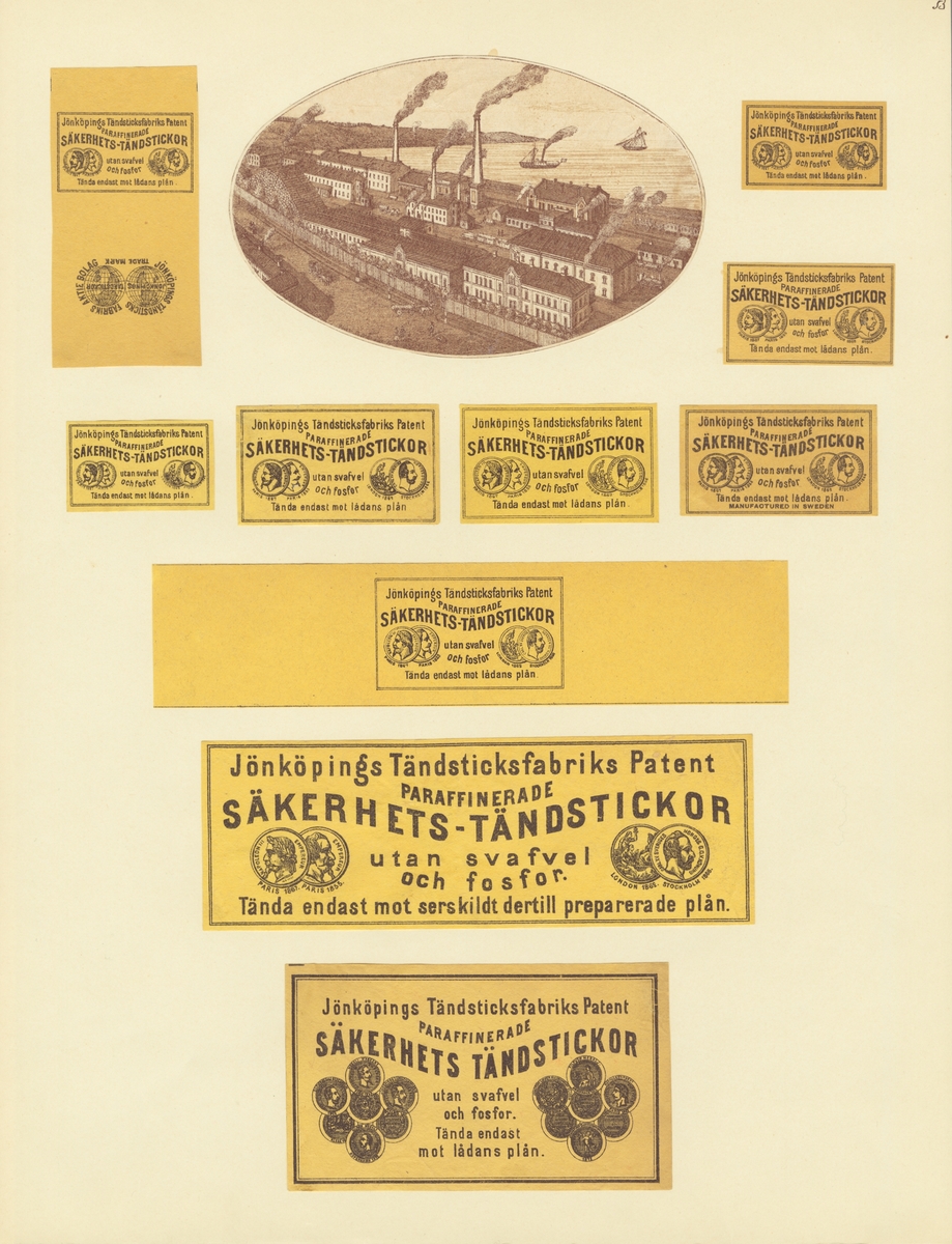 Etiketter för tändsticksaskar, från Svenskt Industri- och Handelsmuseum.