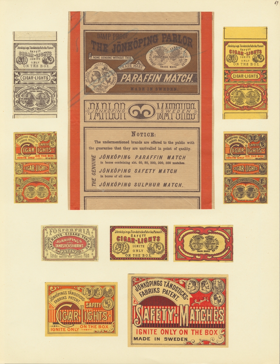 Etiketter för tändsticksaskar, från Svenskt Industri- och Handelsmuseum.
