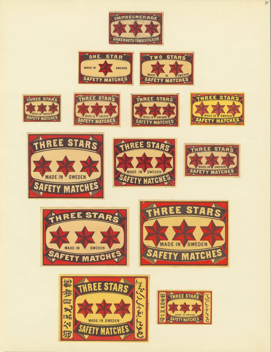 Etiketter för tändsticksaskar, från Svenskt Industri- och Handelsmuseum.