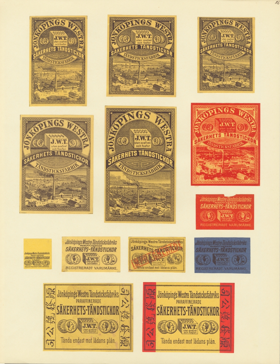Etiketter för tändsticksaskar, från Svenskt Industri- och Handelsmuseum.